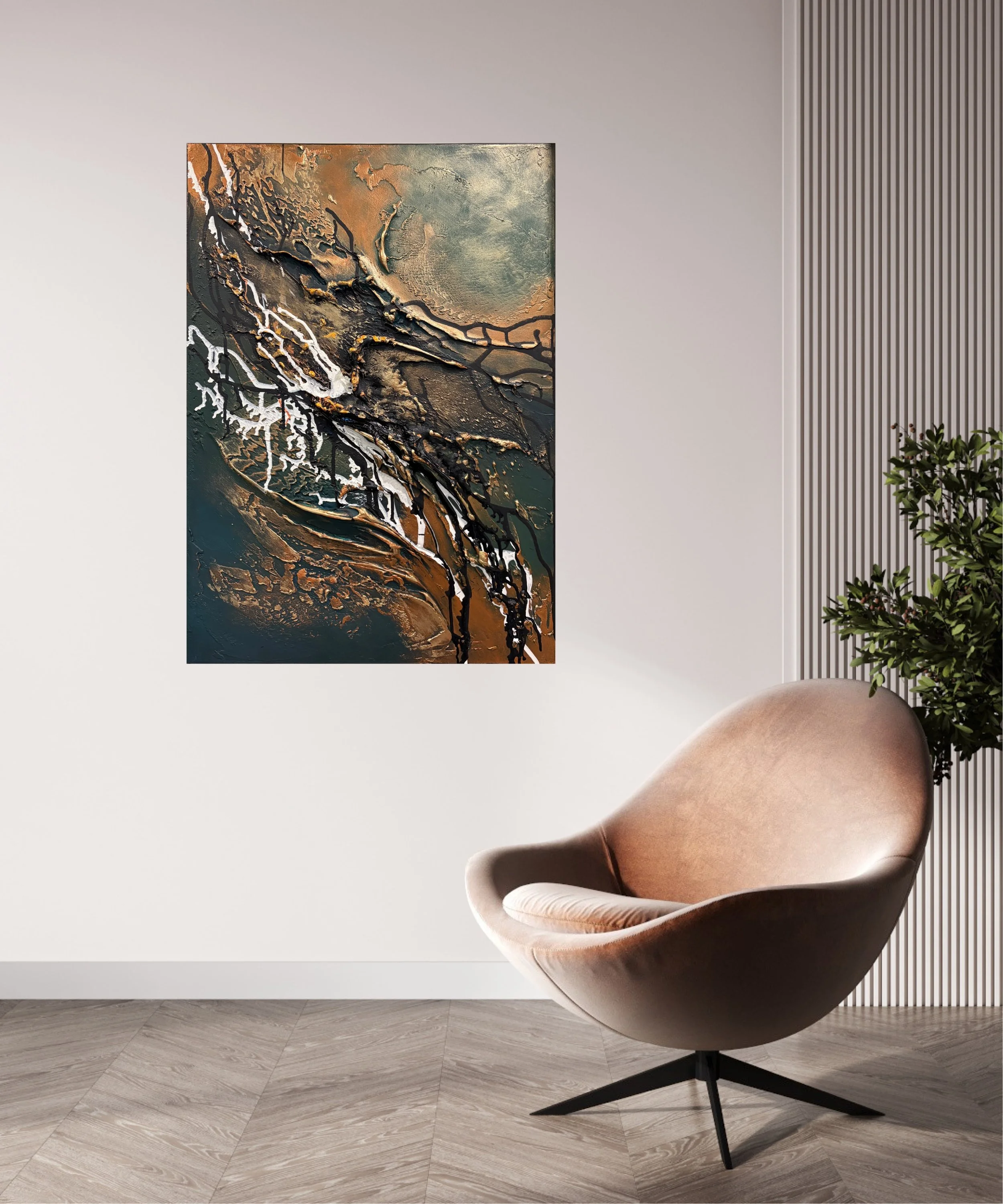 A textured acrylic painting on canvas, featuring rich layers and tactile surfaces that create depth and movement.