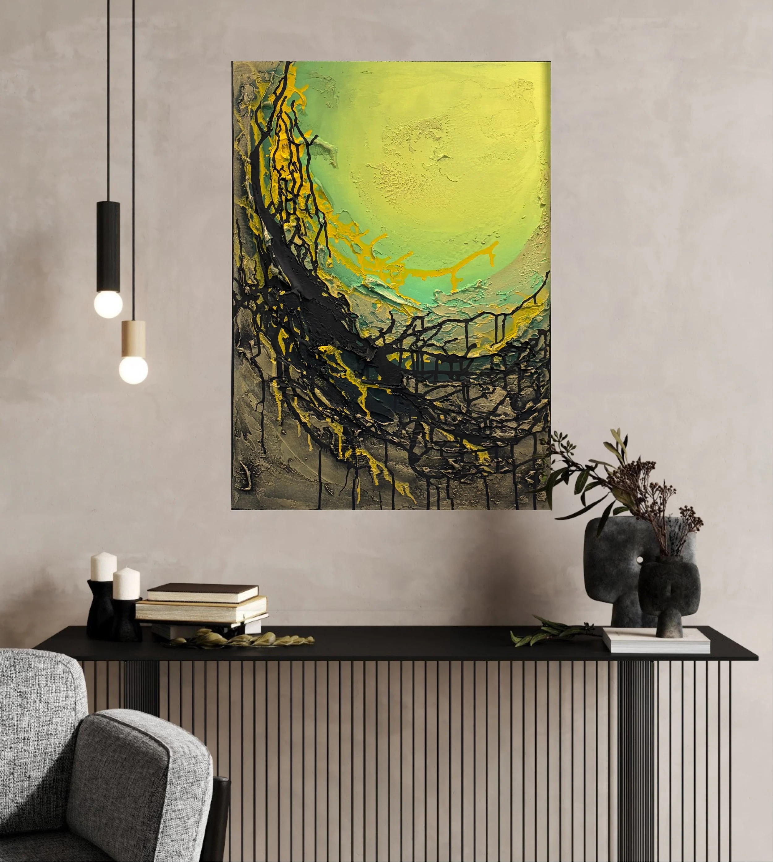 A textured acrylic painting on canvas, featuring rich layers and tactile surfaces that create depth and movement.