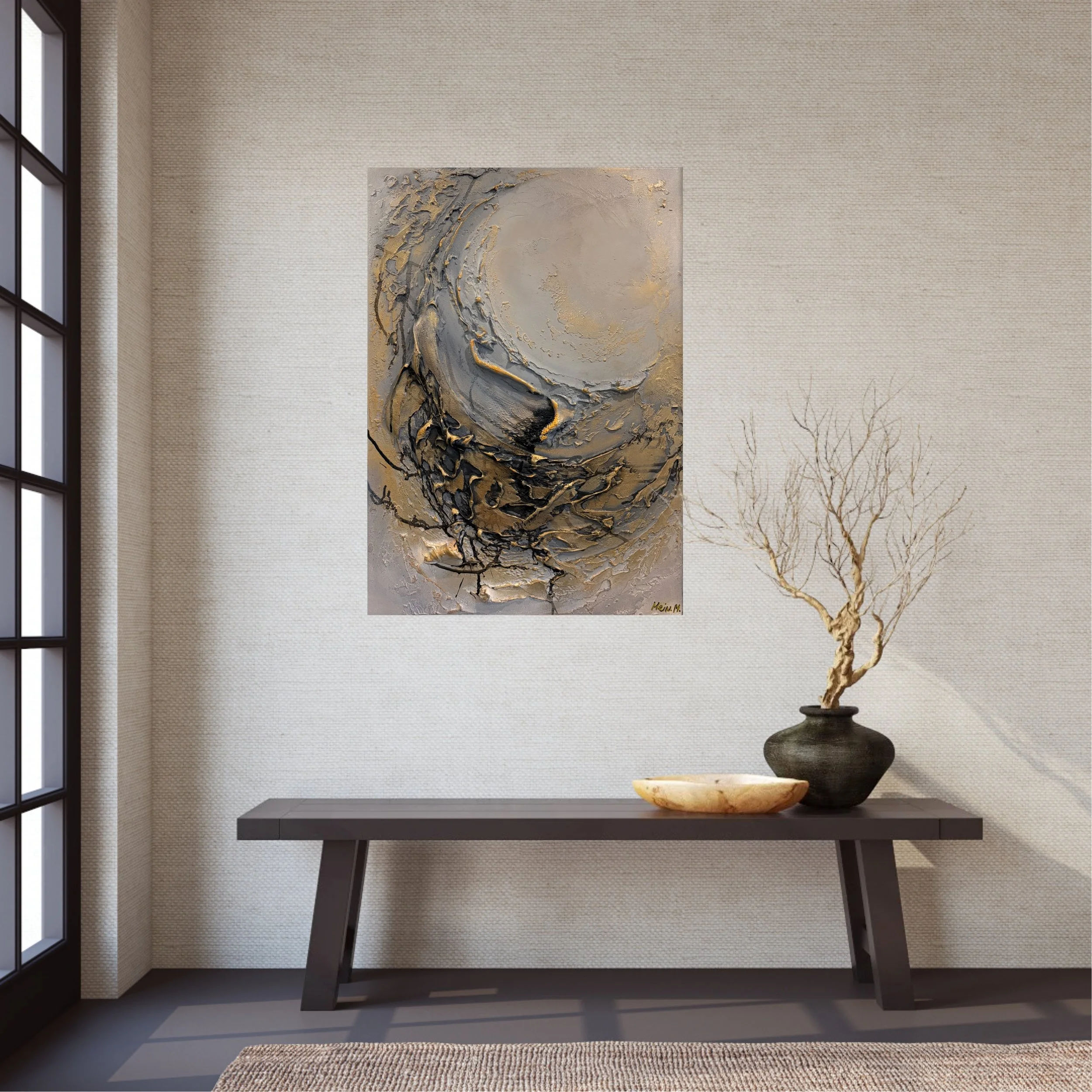 A textured acrylic painting on canvas, featuring rich layers and tactile surfaces that create depth and movement.