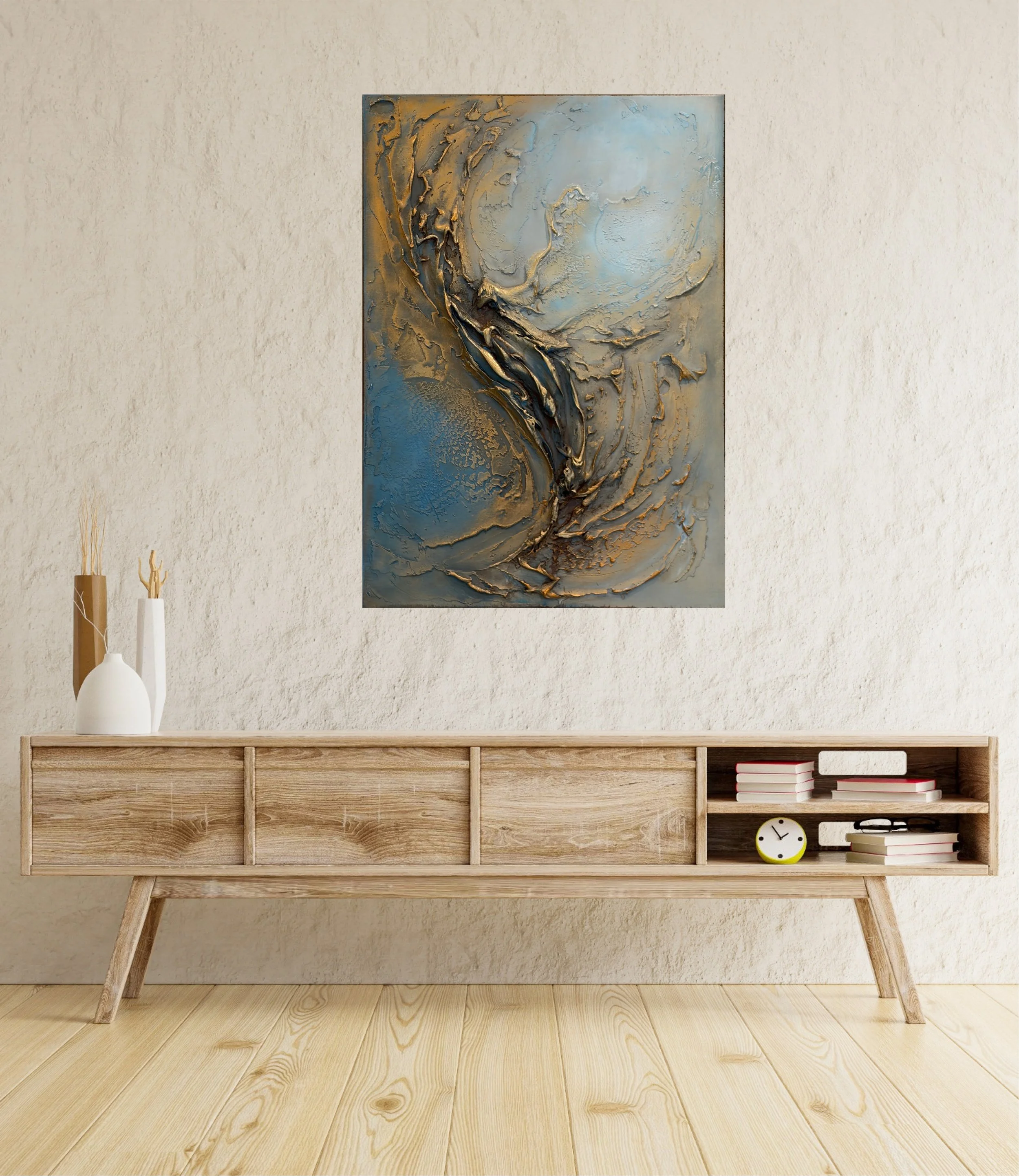 A textured acrylic painting on canvas, featuring rich layers and tactile surfaces that create depth and movement.