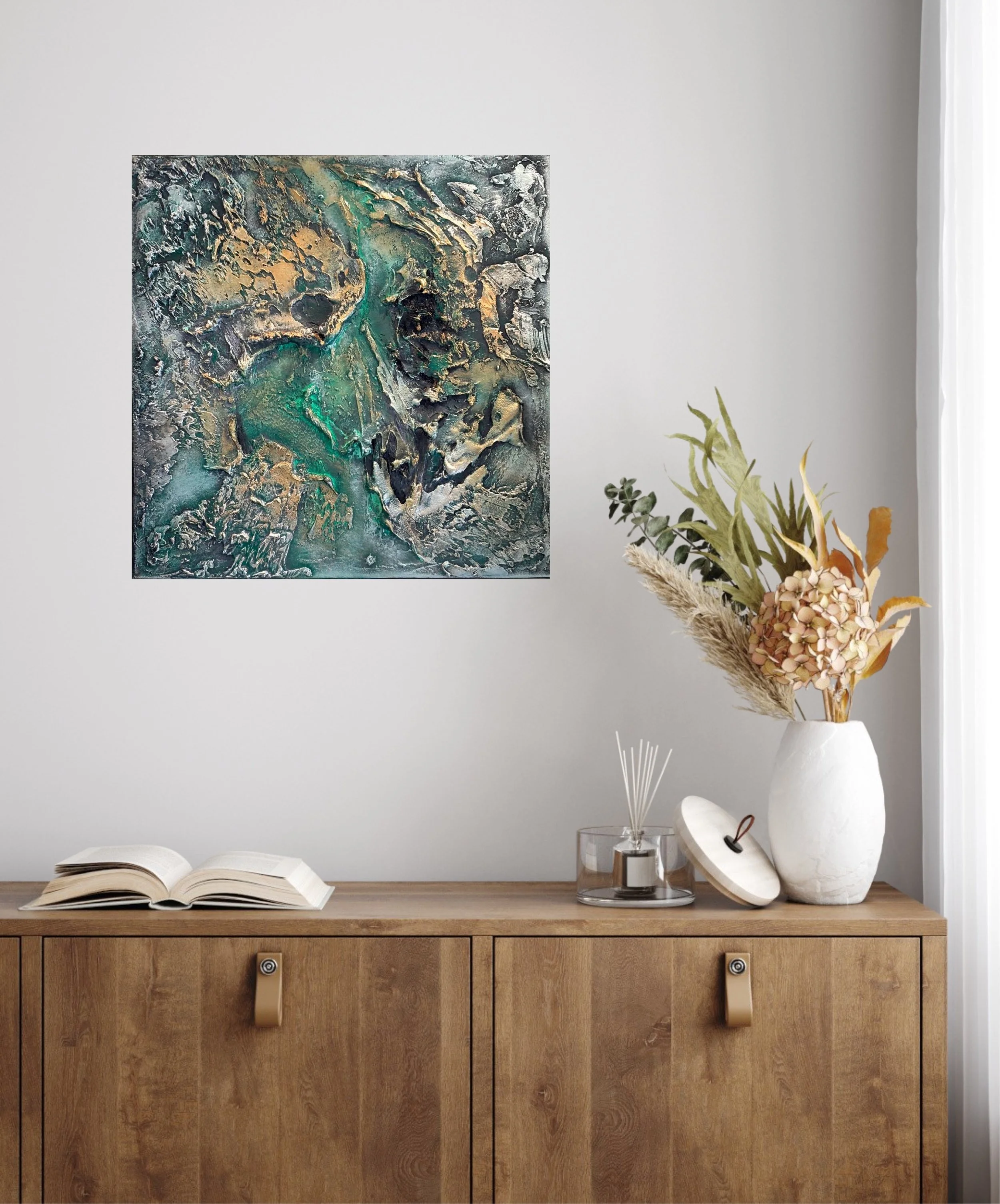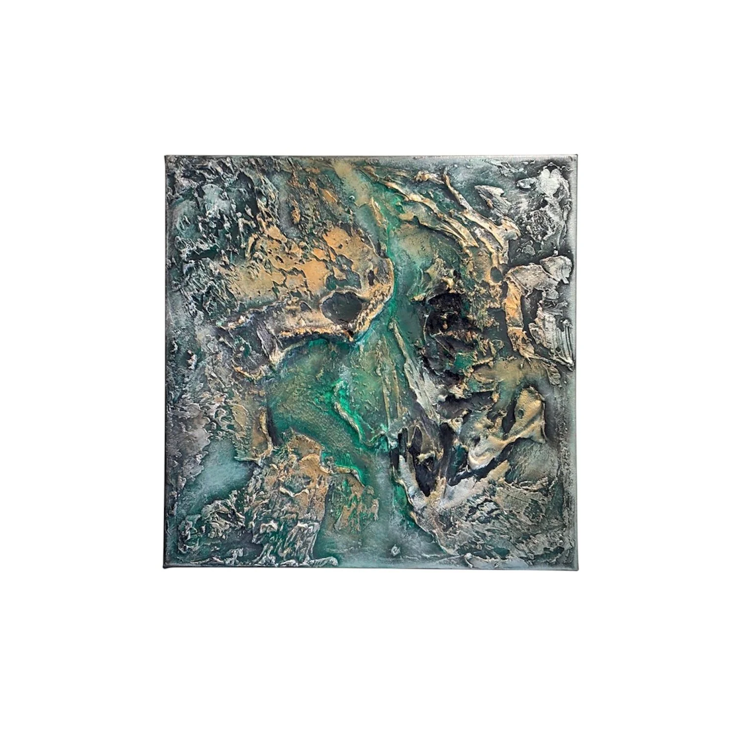 A textured acrylic painting on canvas, featuring rich layers and tactile surfaces that create depth and movement.