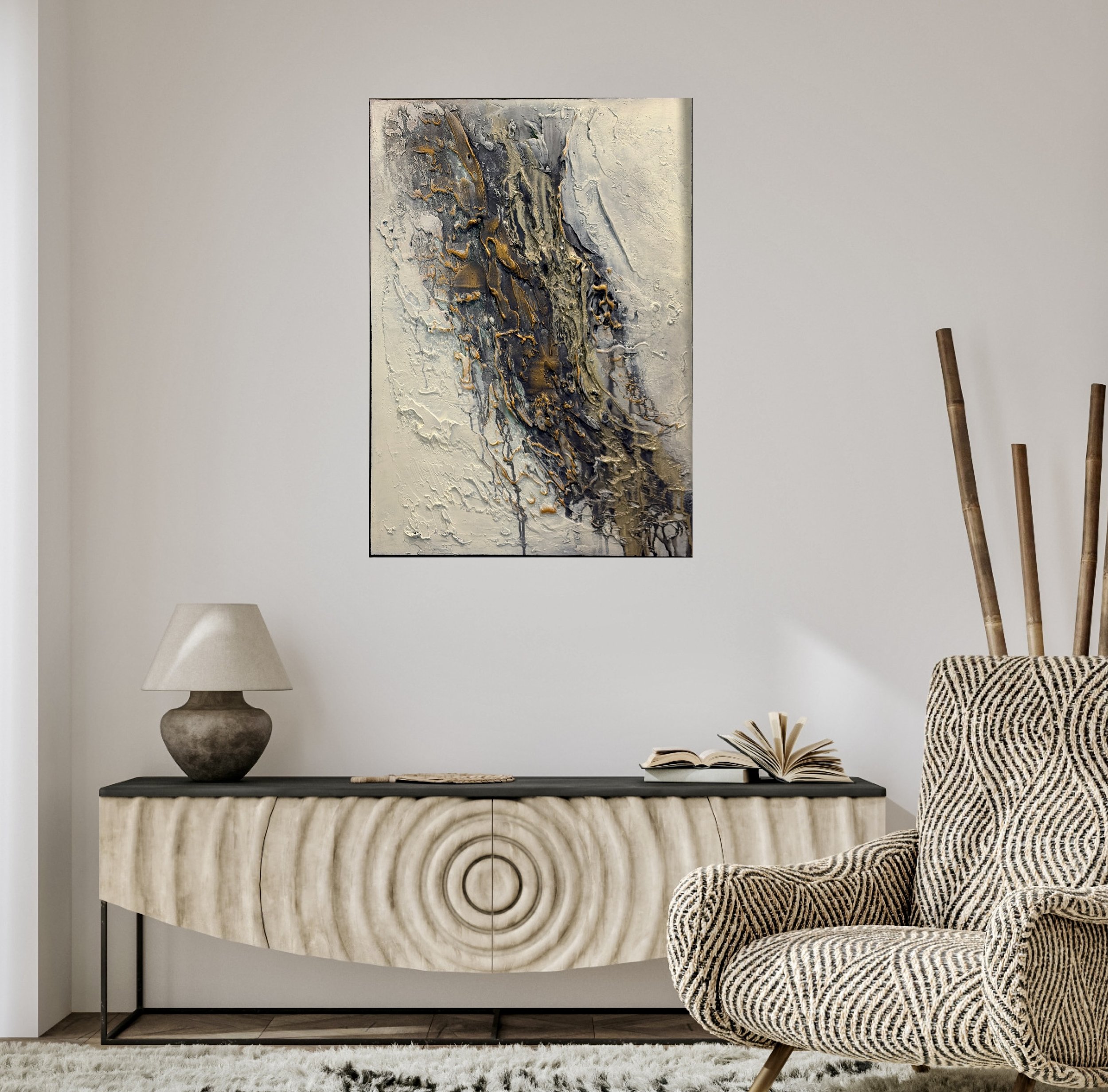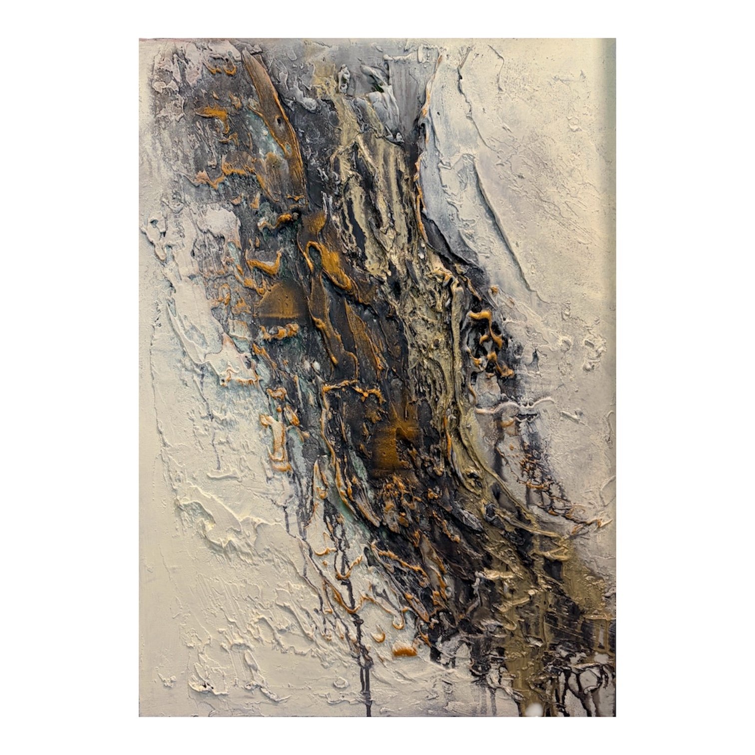 A textured acrylic painting on canvas, featuring rich layers and tactile surfaces that create depth and movement.